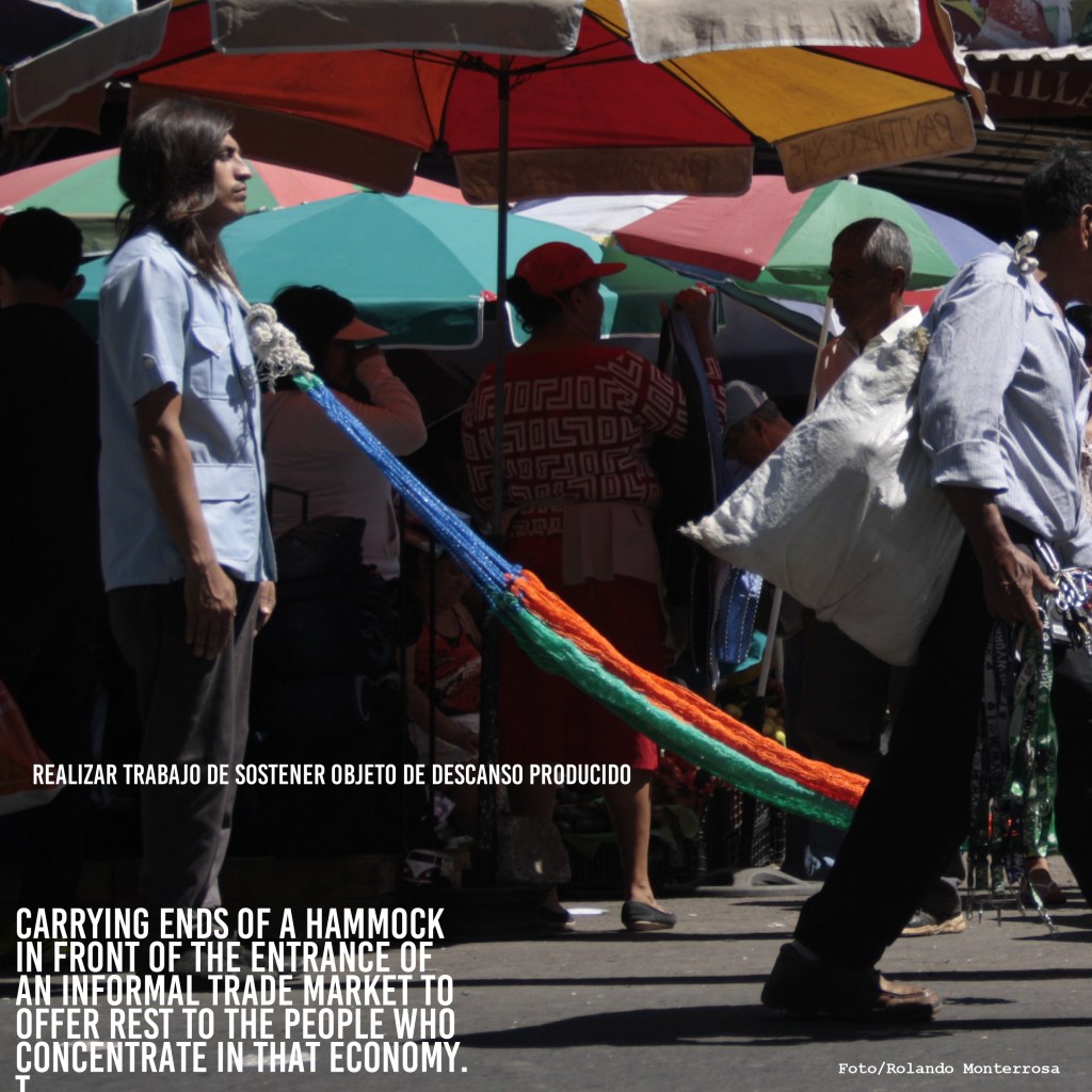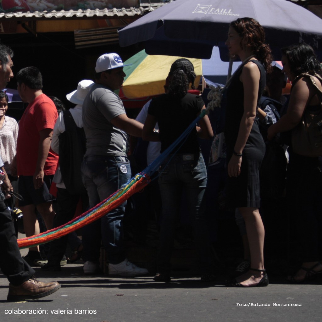 Esta acción, desarrollada por Crack Rodríguez y Valeria Barrios en el año 2014, interrumpe por una hora la entrada del mercado de Santa Tecla. No lo hace con barricadas ni gritos, sino con una tensión callada: dos cuerpos erguidos, inmóviles, atados por los extremos de una hamaca tradicional, enfrentados cara a cara, como si fueran el último punto de apoyo el uno para el otro. La acción emerge de la quietud, pero interroga con fuerza el vínculo entre descanso y trabajo, entre economía y dignidad, entre producción y afecto.