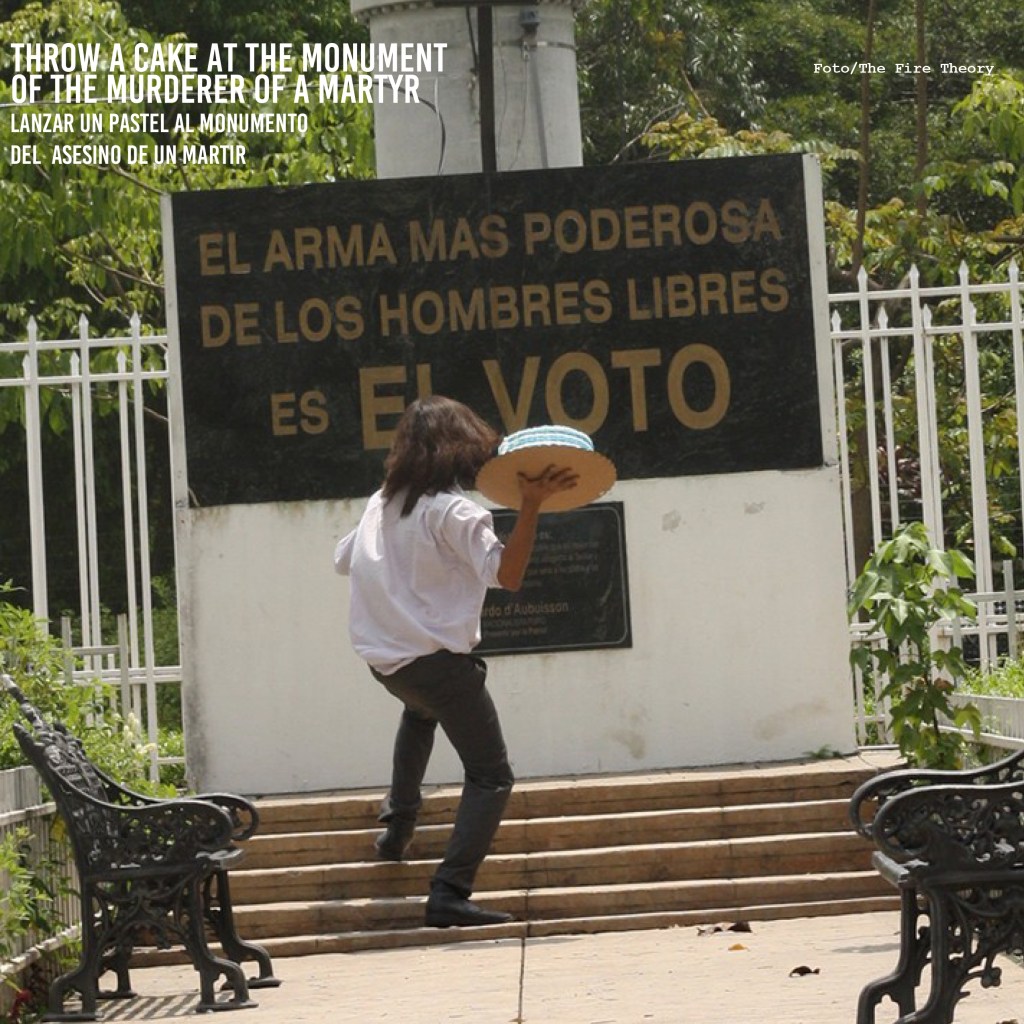 La pieza inicia con la llegada del artista en su viejo Volkswagen celeste, vehículo de carga simbólica, popular y casi arqueológico. Estacionado junto a la frase inscrita en el monumento—“El arma más poderosa de los hombres libres es el voto”—Rodríguez extrae del maletero el pastel, lo desempaca en silencio y, sin más preludios, lo lanza con contundencia sobre la base del monumento. El impacto es estético y político: los restos del pastel se esparcen como una ofrenda grotesca, como una risa amarga frente al monumento de la impunidad.
